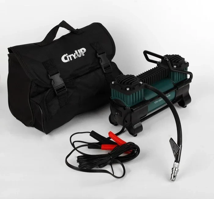 *Автомобильный компрессор Tornado AC-616 (City Up) - мощная двухцилиндровая насосная станция, выполненная в металлическом корпусе, на поддоне. Большая производительность автокомпрессора обеспечивается мощным двигателем, с прямым приводом на поршень через шатун, а также особенной конструкцией перепускных клапанов. Для контроля давления автокомпрессор оснащен манометром, а для надежности и удобства, армированный пневмошланг комплектуется омедненным штуцером и дополнительными съемными насадками. Для хранения и транспортировки компрессора предусмотрена сумка, что, также позволяет избежать спутывание проводов или потерю аксессуаров.